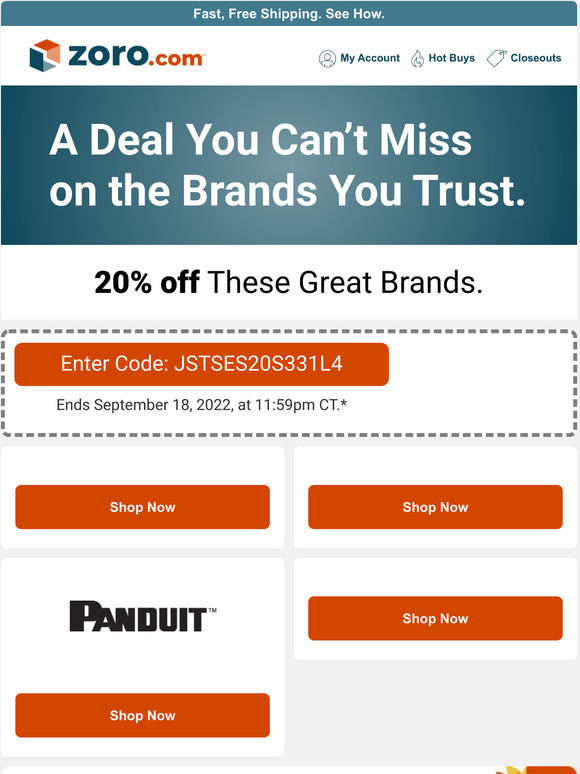 Zoro discount code & voucher codes September 2022 - Groupon Save 15% on a 20.0 1/2" Impact Wrench at Zoro.com until March 31st. No Code Required. Price as M ... [missing en_US 'js.modules.shared.GetDeal' translation] Deal [Missing js.modules.shared.DealOfferType] Free Shipping on Orders of $50+ When You Sign in or Sign Up for An Account. Exclusions apply. Excludes Hawaii and Alaska.