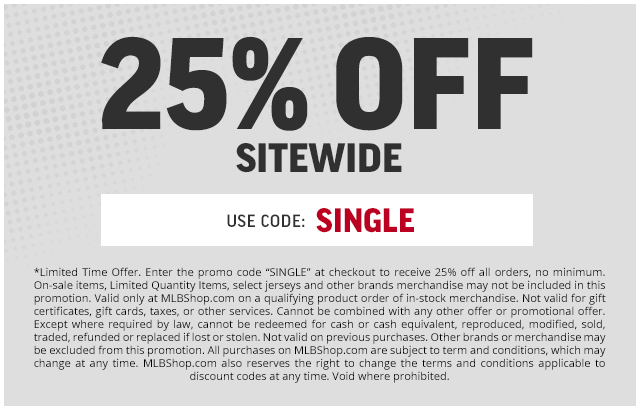 4x Free 25% Off MLBShop.com Codes : mlb MLBShop.com code or link valid for 25% off a single order of qualified, in-stock merchandise at MLBShop.com only. Not valid for gift certificates, codes or gift cards or on previous purchases or returns. Does not apply to purchase of tickets, taxes, shipping, handling or other services.
