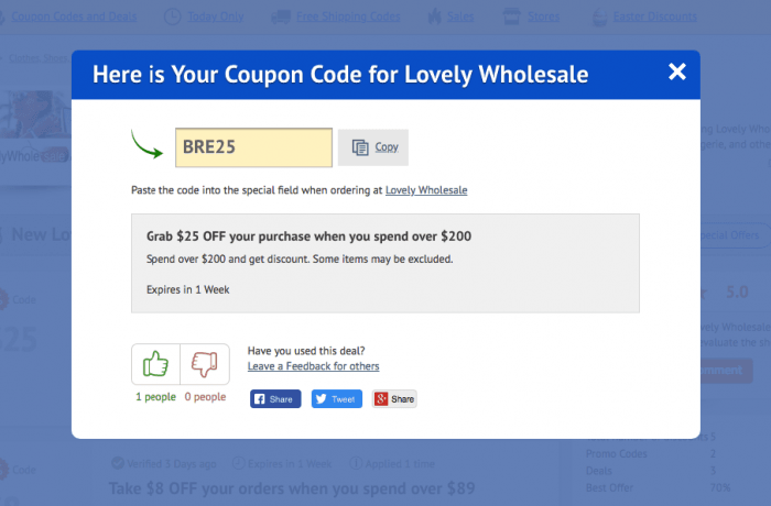 LovelyWholesale Coupons & Promo Codes - RetailMeNot.com LovelyWholesale Coupons & Promo Codes Submit a Coupon Save with 25 LovelyWholesale Offers. UP TO $35 OFF Code Up to $35 Off With Minimum Spend Added by Stde 1 use today Show Coupon Code See Details UP TO 80% OFF Sale Up to 80% Off + Extra 10% Off For Student See Details UP TO $30 OFF Code Up to $30 Off With Minimum Spend Added by VirginiaSlim
