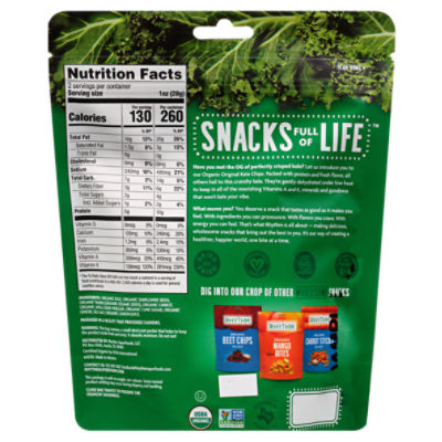 Organic Rhythm Kale Chips 6.25 Ounces - CostcoChaser These kale chips by Rhythm Superfoods are in original flavor, they are minimally processed for maximum nutrition and deliciousness. These chips are dehydrated not baked or fried and for 1 oz (28g) per serving, it contains 150 calories, 70 calories from fat with 0g Trans fat. 150 calories seems like a lot in only 1 oz, but since these chips are ...